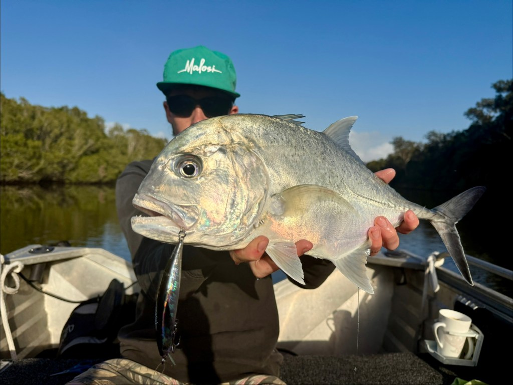 The Malosi Staples range, equipped with many lures for all sorts of anglers, wether you’re chasing fatties in the estuary or even offshore for long tails, the range has it for you. Many of these lures are made for older anglers chasing 20kg GTs off the rock ledges. These GTs usually eat the Chieftain, Talo and Tyrant. These are huge lures that catch huge and exotic fish. The chieftain is a floating stickbait, which means it never dives, the Talo however is a floating popper, big action, big commotion and best of all, big fish. The last in the range is the hero, my favourite by far. Best action and crazy fish caught on them, I have in fact caught one special fish on the lure. A huge GT for the estuary, 55cm of pure GT and estuary blood. I have the entire fight on GoPro but a saving it for a time when I have caught some other fish on them. Here is the photo and the lure.